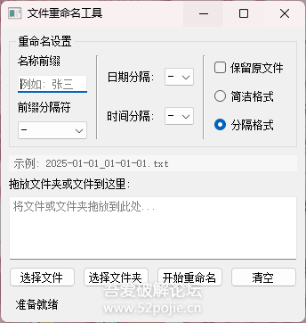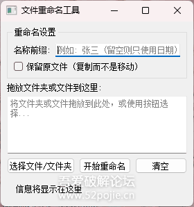 YLxz Renamer v1.0是一款基于Python开发的文件批量重命名工具,其代码由AI编写完成。该软件实现了预想功能的约80%,但缺少文件浏览集成方式;开发者尝试添加更名记录功能以便恢复操作,但因技术难度未能实现。工具打包文件大小为35.6MB,未经过压缩处理;Python编写可能导致部分安全软件误报病毒,但作者保证使用安全。用户若需自定义功能,可复制代码至AI工具中进行修改。下载地址为https://wwnh.lanzoum.com/ihgDP38wcq1i,并提供附加文件“YLxz文件重命名工具.txt”(37 Bytes,下载次数:4)。该工具从最初的批处理更名方式迭代优化而来,原先实用性较低,现已发展到较为适用的状态。